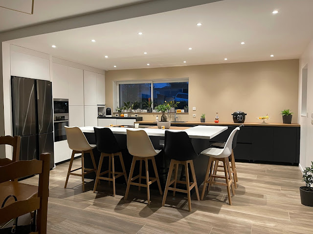 REALISATION D'UNE CUISINE ARMONY MODELE KAPPA LAQUE BLANC MAT PLAN DE TRAVAIL EN QUARTZ BOTTEGA CALIZA NATURE POIGNEE LAST NOIR     CUVE  INOX PAR DESSOUS EGOUTOIR 5 RAINURES DISTRIBUTEUR SAVON VIDAGE AUTO